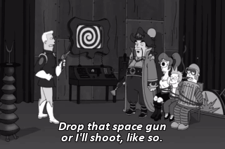 Drop that space gun or I'll shoot, like so. (GROANS) (EXCLAIMS) Oh, Zapp, tie me back up and ravish me. I'd like to, Leela. So, I will. (BOTH LAUGH) (BOTH MOANING)