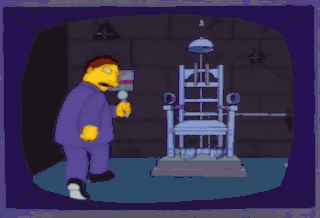 I will now strap myself into this electric chair, which was deactivated over 30 years ago... and, I can only assume, still is. Uh-oh. We didn't reset the safety switch. He's gonna smell like hot dogs.