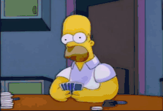 Homer, you want any cards? Homer! Whoo. Don't try to eat these so-called "chips." Do you want another card or not? Huh? Okay. I'll take three. D'Oh! D'Oh! D'Oh! Uh, I mean, Whoo-hoo.