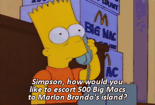 Simpson, how would you like to escort 500 Big Macs to Marlon Brando's island? I can't take much more of this. I'm counting on you, Lise.