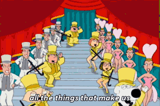 all the things that make us laugh 'n' cry He's a family guy oh, Let's see. We got soda, purple stuff, uh, oh! Sunny D! All right!