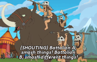 (SHOUTING) Battalion A, smash things! Battalion B, smash different things!