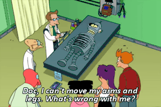 Doc, I can't move my arms and legs. What's wrong with me? This is the worst part of the job. What is it? Good news? Bender, your hydraulics are shot. You'll never move again. You mean-- I'm sorry.