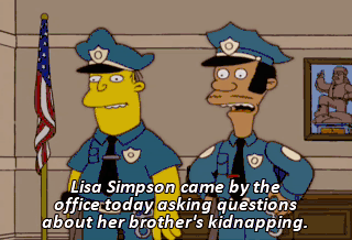 Lisa Simpson came by the office today asking questions about her brother's kidnapping. Questions? Yes. As if she were trying to unravel a tapestry of deceit.