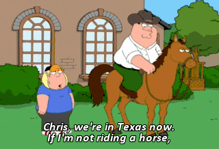 Chris, we're in Texas now. If I'm not riding a horse, I'm gonna stick out like a straight guy in a figure skating competition.