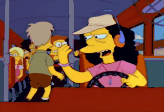 No shoving. just kidding. You can shove all you want. Hey, Otto Man, you can't leave. Milhouse isn't here yet.