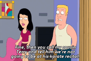 Fine, then you call my cousin Terry and tell him we're not going to be at his karate recital.