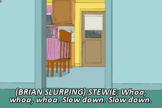 (BRIAN SLURPING) STEWIE: Whoa, whoa, whoa. Slow down. Slow down. Look, Meg, I don't know what your problem is.