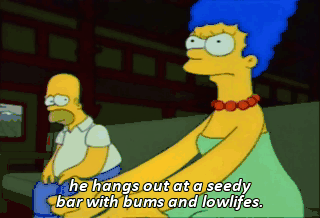 he hangs out at a seedy bar with bums and lowlifes. It's true. It's all true. Homer, don't interrupt. Sorry.