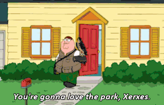 You're gonna love the park, Xerxes. (LAUGHING) I think you know what I want. This is awesome. We should have our own TV show. (ROCK MUSIC PLAYING)