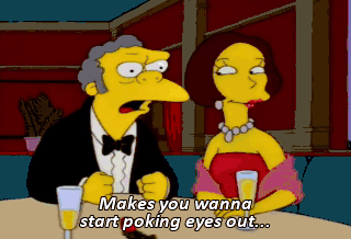 Makes you wanna start poking eyes out... - and slashing guts and kicking throats. - It's okay, Moe. I'm sorry. It's just I'm so happy I met you. Uh, excuse me, sir. Will there be anything else?