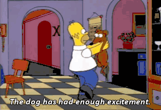 - The dog has had enough excitement. - But, Marge, dogs can never have enough excitement. Look. Whee! Whee! Whee, whee! All right, all right. I won't take the dog. Come here. Aw.
