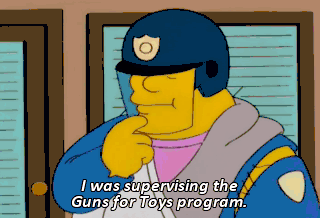 I was supervising the Guns for Toys program. It's Toys for Guns! Now you tell me. Oh! Simpson!