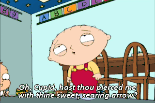 Oh, Cupid, hast thou pierced me with thine sweet, searing arrow? Stomach, cease thy lustful quake. Ahh! Unhand me, woman! I don't have gas! I'm in love! Well then, I guess it's both. Peter, I'm home!