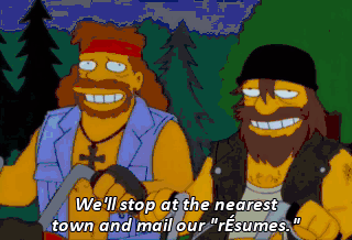 We'll stop at the nearest town and mail our "rÉsumes." "RÉsumes." It still sounds weird to me.