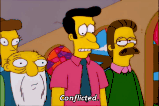 Conflicted. Too bad! You've already signed the deal! Actually, he hasn't. Oh.