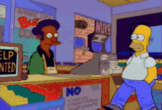 One scratch-for-cash. Here you go. Liberty bell. Two liberty bells. Come on, come on, come on... Oh. Yes! Whoo-Whoo! Three liberty bells! That will be $10,000, Apu. Congratulations, Mr. Homer. Thank you.