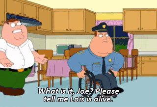 What is it, Joe? Please tell me Lois is alive. (SIGHS) It's been six days, Peter. I'm sorry, but we had to call off the search. I'm afraid you're just gonna have to accept the fact that... She's gone.