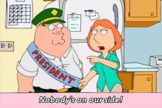 Nobody's on our side! Are you nuts? Look at all these telegrams. "Nice going, Libya." "You da man, North Korea." "Great job, Iraq." Iraq, Lois! You know what?
