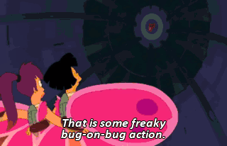 That is some freaky bug-on-bug action. I feel a little left out. (GROANING) Is Fry going to be okay? I don't think so.