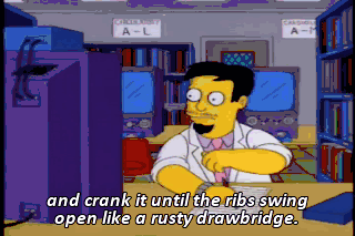 and crank it until the ribs swing open like a rusty drawbridge. Ah! No! Blood! Ugh! Next, make an incision in the coronary artery-- And we are back with more of People Who Look Like Things.