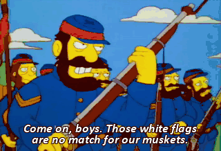 Come on, boys. Those white flags are no match for our muskets. - Charge! - And the Springfielders... heroically slaughtered their enemies as they prayed for mercy.