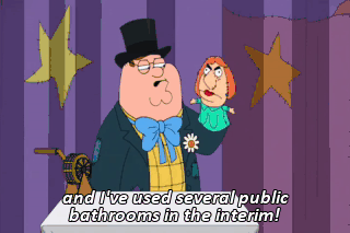 and I've used several public bathrooms in the interim! (IN NORMAL VOICE) Sounds like this could go on for a while, kids. Hey, Saggy Naggy, I know what'll cheer you up. Do you like pie?