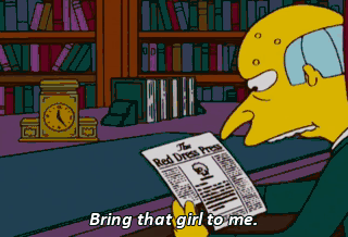 Bring that girl to me. I'm sorry, Mr. Burns, but my paper is not for sale. Maybe a little gift will change your mind. Send in Sugarbell. She's very pretty.