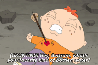 (GRUNTING) Hey, Bertram, what's your favorite kind of bottled water? Huh? Mine's Arrowhead. (WAILING) Wow, that was dramatic.