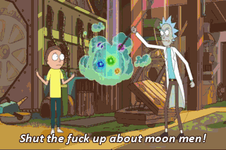Shut the fuck up about moon men! This isn't a musical number. This is a fucking operation. We got to be cool and fucking lay low. Duck, duck, birdie? That's very funny! Here comes another funny.