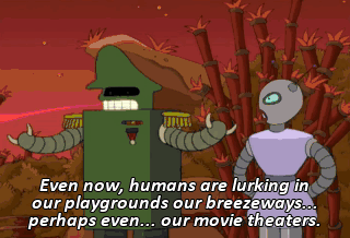 Even now, humans are lurking in our playgrounds our breezeways... perhaps even... our movie theaters. God help us! Okay, keep an eye out for Bender.