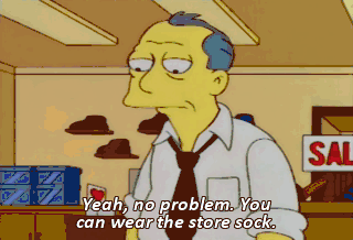 Yeah, no problem. You can wear the store sock. Ew. Would you mind lacing 'em up, kid? I have a bad back.