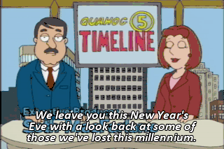 We leave you this New Year's Eve with a look back at some of those we've lost this millennium. Kevin asked me to Quagmire's millennium party! I am so psyched!