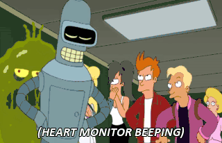 (HEART MONITOR BEEPING) Huh? What's that? I took a nappie! I don't believe it. She's alive! Bender's rhythmic chest compressions restarted her heart. He's a big ol' hero!
