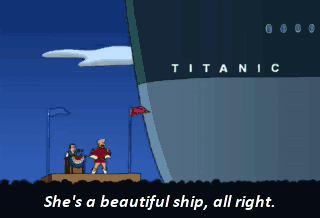 She's a beautiful ship, all right. Shapely, seductive. I'm going to fly her brains out. And now, without further ado I christen this ship Titanic. Uh-huh. oof!