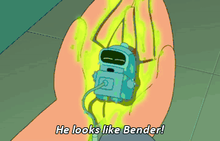 He looks like Bender! (ALL GASPING) Oh, no, no, no. No way am I that kid's dad! Wipe my tiny metal ass! Aw, crap.