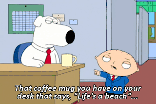 That coffee mug you have on your desk that says, "Life's a beach"... that's dangerously close to the word "bitch," isn't it? Yeah, that's the joke.