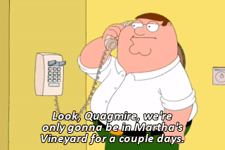 Look, Quagmire, we're only gonna be in Martha's Vineyard for a couple days. Can't you just watch the kids? Man, you're more of a letdown than Fruit Stripe Gum.