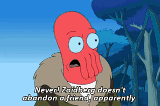 Never! Zoidberg doesn't abandon a friend, apparently. (WHIMPERING) (GROWLING) I'll save us by scaring him off with my crazy war noise. (PURRING)