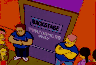 Clear the way. Clear the way! Performer coming through! This is so exciting. Last time I got to go backstage was when Bart ripped his pants at the Christmas play. - Mom! - Ha-ha! Hello, bands!