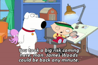 You took a big risk coming here, man. James Woods could be back any minute. I know. How fast can you do it? As fast as Spider-Man when he gets laid.