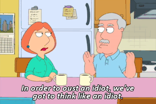 In order to oust an idiot, we've got to think like an idiot. Let's see. What's Peter's weakness? He's gotta have a weakness.