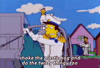 shake the plastic bag and do the twisty thingy too the garbageman Oh, the garbageman can