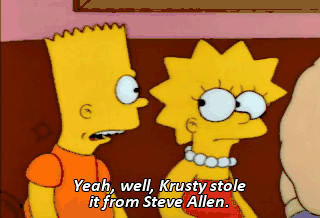 Yeah, well, Krusty stole it from Steve Allen. Oh, everything's stolen nowadays. Why, the fax machine is nothing but a waffle iron with a phone attached. It's ringing. Hello. Is this Krusty the Clown?