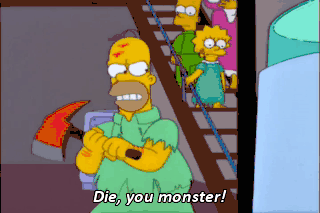 Die, you monster! Dad, that's the water softener. Well, I am missing the back of my head. I think you could cut me some slack.