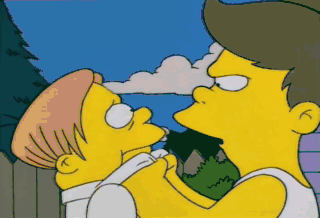 Hey, no one manhandles the bosom chum of Nelson Muntz! Spring forth, burly protector, and save me! Ah, geez!