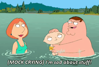 (MOCK CRYING) I'm sad about stuff! (MOCK CRYING) (GASPS) You son of a bitch! Don't even joke about that! This water feels kind of funny. Yeah, and it smells bad.