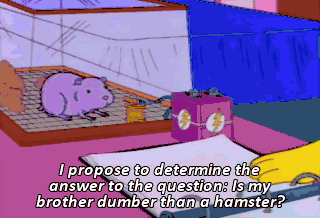 I propose to determine the answer to the question: Is my brother dumber than a hamster? Hey, Lise, look what I can do. Doggone it.