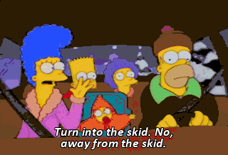 Turn into the skid. No, away from the skid. Hit the brakes! Floor it! - Go with it! - Shut up. One at a time. Lisa? Bail out! Oh, that was close.
