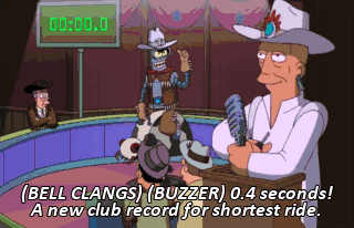(BELL CLANGS) (BUZZER) 0.4 seconds! A new club record for shortest ride. Told you! Yee-haw! Still, someone should eat the hat. (BELL CLANGS) (GRUNTING)
